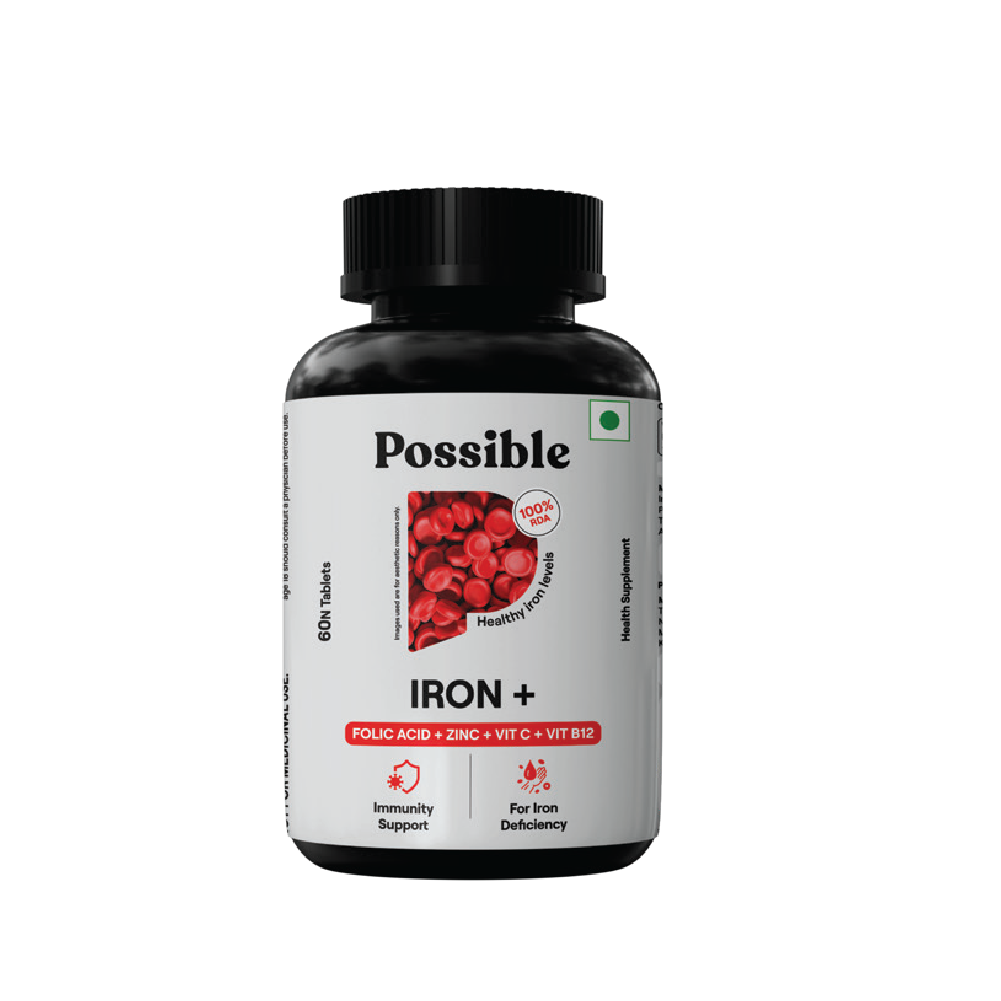 Iron is an essential mineral that helps your body’s growth and development. Possible’s Iron+ tablets are not only good for maintaining your body’s iron level, but also contain folic acid, zinc, vitamin B12, & vitamin C. All these nutrients perform a pivotal role in maintaining healthy bodily functions. It is also effective in increasing haemoglobin, preventing anaemia, and maintaining energy levels.