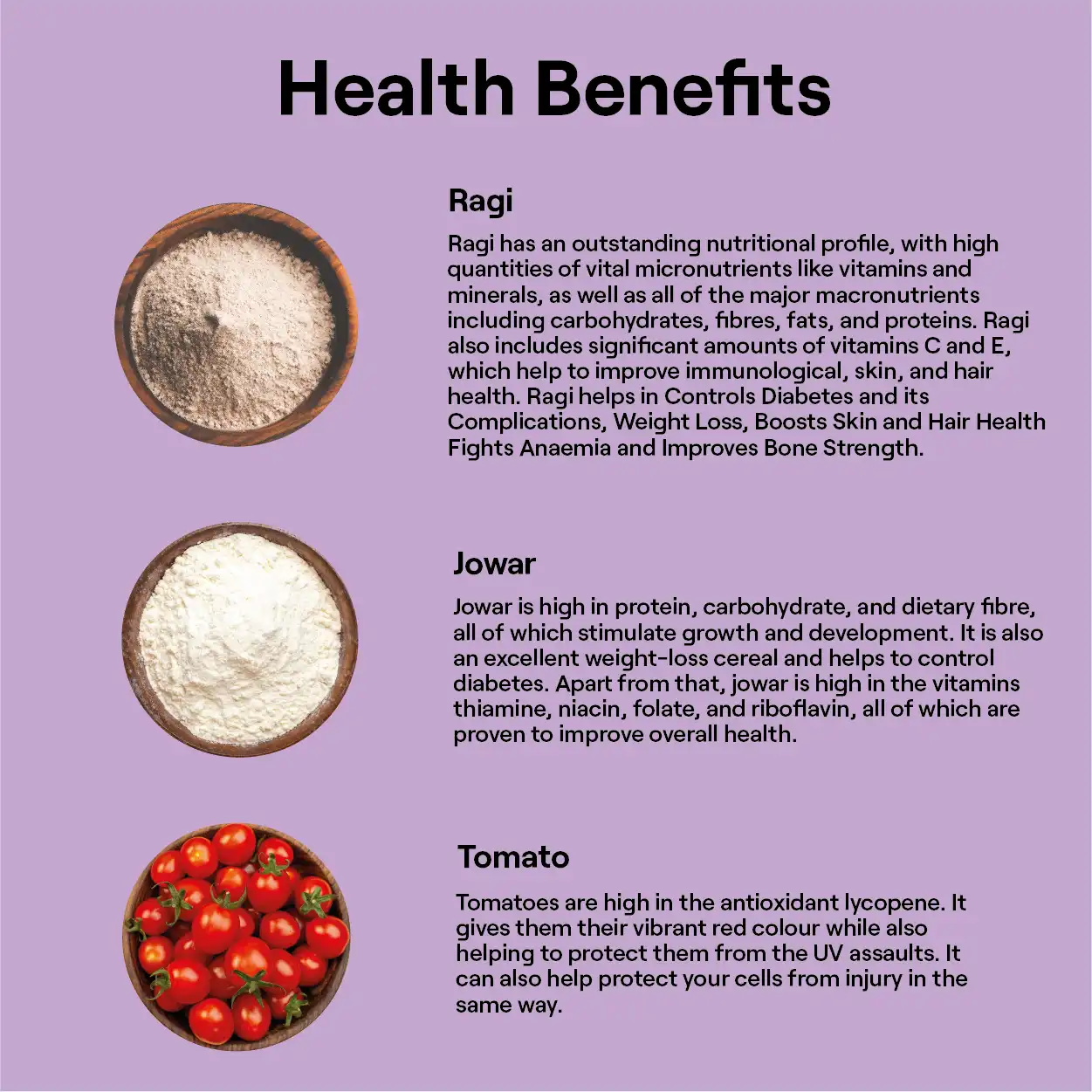 - Ragi helps in Controls Diabetes and its Complications, Weight Loss, Boosts Skin and Hair Health Fights Anaemia and Improves Bone Strength.